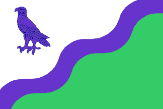 A flag divided by a blue diagonal wavy stripe from bottom hoist to upper fly, the top hoist white with a blue falcon, the bottom fly green. Thus almost a banner of the city arms, as it appears in the city webpage.