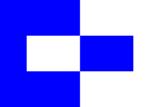 Flag: Rectangular, with proportions 2:3, made of two equal vertical stripes, at hoist blue, at fly white, with a counter colored rectangle of 1/3 of the flag's hoist and 2/3 of the flag's length.