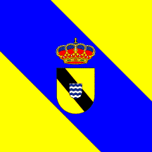 Flag: Quadrangular flag, with proportions 1:1, tierced diagonally, the triangle at fly yellow, the central bend blue and the triangle at hoist yellow. In the middle of the flag is placed the municipal coat of arms in full color.