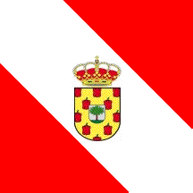 Flag: Quadrangular flag, tierced by the descending diagonal, the triangle at fly red, the central stripe white and the triangle at hoist red, charged in the middle with the municipal coat of arms in full colors.