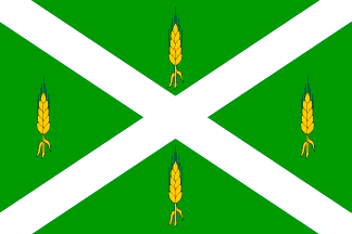 Flag: Rectangular flag with proportions 2:3, made of a green panel with a white saltire throughout cantonned by four yellow wheat spikes.