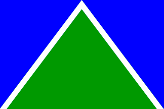 Flag: Rectangular flag, with proportions 2:3, made of a blue panel with a white triangle with vertices in the lower corner of the flags and in the midpoint of the upper edge of the flag, over a green triangle inscribed in the previous one, of 1/20 the hoist.