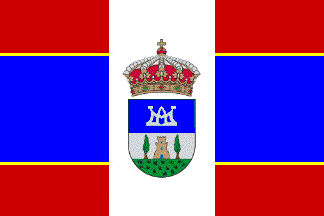 Flag: The flag shall be of rectangular shape, with proportions 2:3, made of three horizontal stripes separated by a golden fimbriation, in respective proportions 1/4, 1/2 and 1/4, the upper and the lower purple red, the central blue, with a vertical white stripe of 1/3 the hoist charged with the municipal coat of arms.
