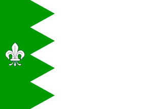 Flag: Rectangular flag with proportions 2:3, made of two serrated vertical stripes, at hoist green with a white fleur-de-lis, at hoist white, with proportions 1:3 and 2:3.