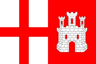 Flag: Rectangular flag, with proportions 2:3, made of two equal vertical stripes, at hoist white with a red cross throughout, at fly red with a white castle masoned sable.