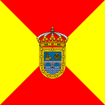 Coat of arms: Azure a two-arched bridge argent over waves argent and azure in chief scallop or and a column of the same, a bordure or a chain sable with 11 links. The shield surmounted with a Royal Spanish crown.