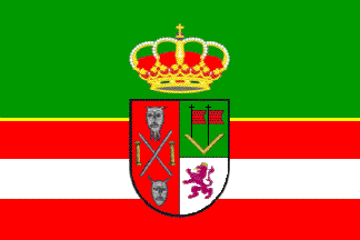 Flag: Rectangular, in proportions 2:3, made of four horizontal stripes in respective proportions 1/2, 1/3, 1/3, 1/3 [2:1:1:1], the upper vert, the second and the lower gules, and the intermediate white, the first two stripes separated by a golden fimbriation.