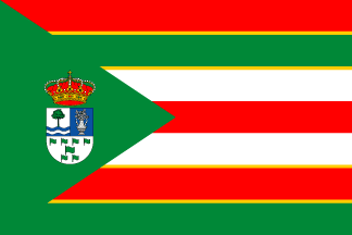 Flag: Of rectangular shape, made of seven equal horizontal stripes, red and green in the upper part, green and red in the lower part, red flanked by two white stripes in the central part, separated by a golden border, a green triangle at hoist charged with the municipal coat of arms.