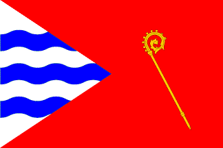 Flag: Rectangular flag, with proportions 2:3, red with a yellow crozier and a white triangle charged with blue waves with vertices in the upper and lower hoist and in the middle of the flag.