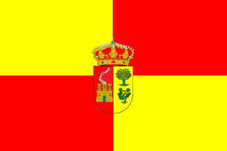 Flag: Rectangular flag, in proportions 2:3, quartered yellow and red. Overall in the center of the panel, the municipal coat of arms.
