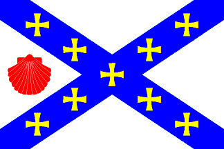 White flag with a blue saltire bearing nine yellow crosses formy. On the hoist, a red pilgrim's escallop.