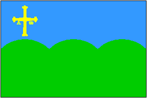 Horizontally divided flag, light blue over green, with the diving line forming three curved sections, thus resembling a heraldical coupeaux or triple-mount. On the canton, the Asturian cross of victory.
