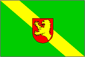 Green flag with a yellow stripe from top hoist to bottom fly, not touching hoist or fly; the municipal arms centred.