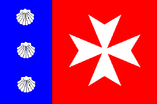 On a red field, the cross of St. John. On the blue hoist third, three white seashells.