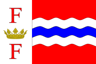 Flag: With proportions 2:3, tierced at hoist. At fly, gules (or red), waves argent and azure. At hoist, argent, two letters "F" gules (or red) and a Ducal coronet or (or yellow) in the middle.