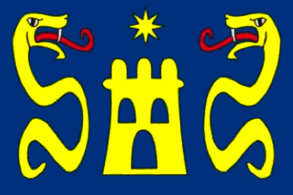 On a field azure, tower and star of yellow, flanked by serpents facing one another and langued red.