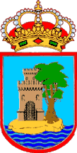 En campo azul claro, un castelo de base cadrada rematado nunha torre almeada, todo en ouro; na parte baixa unha porta con arco de medio punto, dúas fiestras cuadrilongas no corpo medio e dúas troneiras, tamén cuadrilongas, na torreta. Cingendo, en parte, o castelo, pola súa banda esquerda unha oliveira de sinople con tronco en marrón. Todo nun cotarelo en siena, sobre un mar de seis franxas ondeadas de azur mariño. A bordura en gules, separada por unha pequena cinta branca. Ó timbre, coroa real pechada.