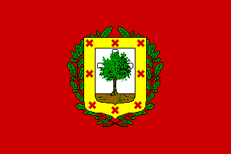 The flag of Biscay (Vizcaya/Bizkaia) province has the coat of arms, charged with the Gernika oak on a base proper covering a silver cross, on a silver field, with a border of gold bearing eight red saltires, uncrowned, all on a dark red background. This gif was based on images at the Biscay Provincial Council Official Website.