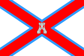 White flag with a red saltire fimbriated light blue, on its centre (not touching the fimbriation) a white tower with red gate and windows.