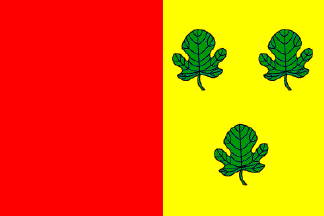 Flag: Rectangular flag with proportions 2:3, made of two equal vertical stripes, the stripe at hoist red and the stripe at fly yellow with three green fig tree [higuera]'s leaves placed 2 and 1.