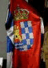 Flag: Quadrangular panel, with proportions 1:1, divided into three equal vertical stripes, the central stripe red with the municipal coat of arms in the middle and the other stripes checky of 15 pieces, eight white and seven blue.
