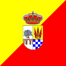 Flag: Quadrangular, divided by the ascending diagonal or and gules [yellow and red], charged with the municipal coat of arms.