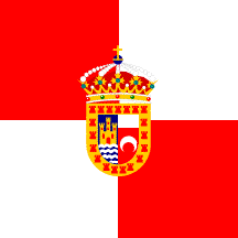 Coat of arms: Per pale, 1. Azure a castle or port and windows gules over waves argent and azure, 2. Gules a crescent argent per fess a chief of the same, a bordure or with 19 towers gules. The shield surmounted with a Royal Spanish crown.