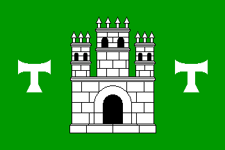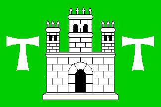 Green with a white castle as high as 7/9 of the flag's height, with black gate and windows, and on each side a white cross of St Tecla [similar to a St Anthony's or Tau cross], as high as 1/3 of the flag's height. Ratio 2:3.