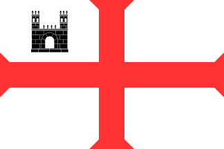 White flag with a formy red cross throughout, its arms as wide as 1/6 of the flag's height, endings as wide as 3/10 of the flag's height, on the canton a black two-towered castle with white gate and windows, as high and long as 5/18 and 5/27 of the flag's height and length, respectively. Ratio 2:3.