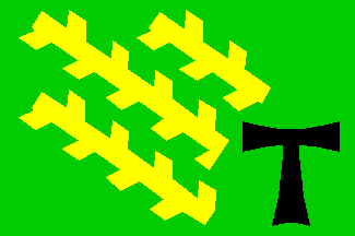 Green flag with three yellow straws placed diagonally from top hoist to bottom fly, with a black cross of Saint Tecla [sic] placed on the bottom fly. Ratio 2:3.