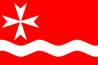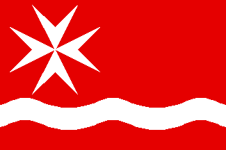 Red flag with a wavy white stripe as wide as 1/6 of the flag's height and set apart from the bottom by that same dimension. On the canton, a white Maltese cross half as high as the flag and separated from top and hoist by 1/18 [of the flag's heght?].