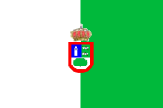The former flag of Buenavista del Norte is vertically divided white (hoist) and green (fly), with the coat of arms in its centre.