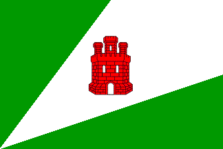 Flag: Rectangular, with proportions 2:3, made of three contiguous triangles with a common vertex in the lower hoist and the two other in the midpoint of the flag's upper border and in the fly's midpoint, the outer triangles green and the central triangle white with a red castle.