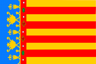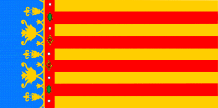 According to Calvo and Grávalos 1983, drawing 666, the flag of the Comunidad Valenciana is defined in the Organic Law 5/82 of July 1st 1982, published in the Boletín Oficial del Estado number 164: Article 5, 1: "The traditional flag of the CV is made up of four red stripes on a yellow field crowned over a blue band by the hoist." 2. "A Law of the Cortes Valencianas [the autonomous parliament] may determine the heraldical symbols of the Community which shall contain those [arms] of the provinces of Castellón, Valencia and Alicante, and its incorporation to the flag over the stripes." The drawing is similar to Jaume's, with a ratio of 2:3, but the precious stones are -E-S-E-S- (E: emerald or green oval; S: sapphire or blue quatrefoil; each hyphen would represent a pearl or white circle), from bottom hoist to top. The width of the blue band (including the thin red stripe carrying the jewels) is about 1/5th of the fly.