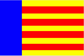 Self-government 11 March 1978. Given in Petra Sancta code; it is not clear whether this flag was merely a proposal. It is a yellow flag divided by four red horizontal stripes with a vertical blue stripe at the hoist; ratio is 2:3. Note that the same flag is given on p.190 of [ped79a] as that of the Balearic Islands.