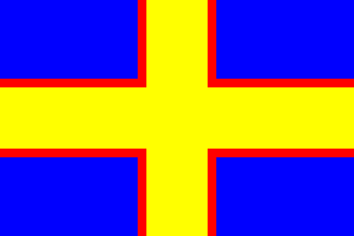 Flag: Rectangular flag, with proportions 2:3, made of a blue field with a yellow cross throughout fimbriated red, of 1/3 of the flag's hoist.