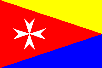 Flag: Rectangular flag, with proportions 2:3, made of a red triangle with its vertices in upper and lower hoist and in the midpoint of the fly, with a white Cross of St. John, the upper triangle yellow and the lower triangle blue.