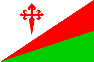 Flag: Rectangular flag, with proportions 2:3, made of three triangles with a common vertex in the lower angle of the hoist, and the others in the upper angle of the fly and in the center of the fly, the upper triangle white with a red Cross of Saint James at 1/3 of the hoist, the central red and the lower green.