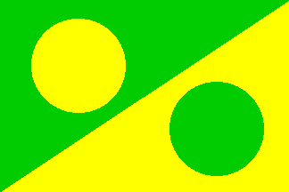 Flag: Rectangular flag, with proportions 2:3, made of two triangles formed by the diagonal running from lower hoist to upper fly, at hoist green with a yellow circle, at fly yellow with a green circle.