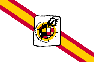 The flag of the Royal Spanish Football Federation (in Spanish Real Federación Española de Fútbol, RFEF) is white with a diagonal stripe in the colours of the Spanish flag and with the federation's emblem in the centre. The flag has a ratio of 2:3 like most Spanish flags. I do not know the adoption date, but I believe it dates from the early 1990s. The Royal Spanish Football Federation was constituted on 29th September 1913 and is a member of both FIFA and UEFA.