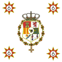 This is the Colour of the 6th Regiment of Infantry Málaga, of Joseph Napoleon's I army (1810-1812). This flag was regulated by Decree of Joseph Napoleon I of 24 March 1809. The mast measured 2 m and the cloth was square with 1.2 m sides. The coat-of-arms was a modified version of the former (Bourbon) arms, including new quarters for Navarre and the Indies (America), an inescutcheon with the French Napoleonic imperial arms and the collar of the Order of Spain around the shield. Source: Manzano 1997 [mzn97].