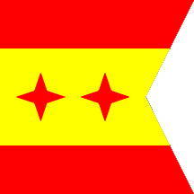 Square swallowtailed national flag 40 cm wide with two regular four-pointed stars of red bunting, placed horizontally on the yellow stripe. The width of the stars shall be half the width of that stripe [i.e. 1/4 of the hoist. The stars are placed so that the distances in between them and from the last star to its nearby side are all the same. In other words, the remaining horizontal bits of yellow are uniformly distributed. As with the Infantes' standard, the swallowtail cut is 1/4 of the length deep. Stars are centred on the remaining 3/4.]