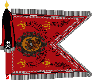 The standard was a scarlet swallow tail pennant with silver fringes and converging edges. At every edge were images of silvery chains. Upon the cloth were black Rocaille ornaments. In its centre was an image of St. Michael defeating Lucifer in an oval flanked by four golden fleur de lis. At the top of the red and white flagpole were red and black cravattes, the latter decorated with a white skull and crossbones. According to Calvo and Grávalos 1983 [cag83] (p.118-119, flag no.270), the royal coat of arms was in the centre of the reverse.