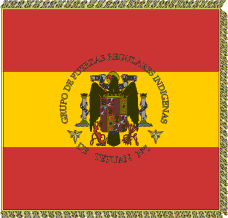 This is the Colour of the Fuerzas Regulares de Ceuta ("Ceuta Regular Forces") Infantry Regiment, 1938-1940. It is an example of the new flags issued from 1938, which restore the pre-Republican colours and proportions and incorporate the new 1938 coat-of-arms. Source: Manzano 1997 [mzn97].