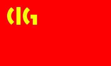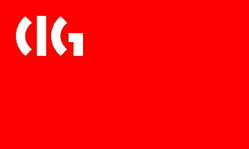Its flag, as shown at official website (direct image link) is red with the lettering logo in white at the upper hoist (in modified Soviet style). The logo consists of the letters "CIG" in a very stylized sans-serif extra-open style, the "G" made from two separate parts — one identical to the "C."