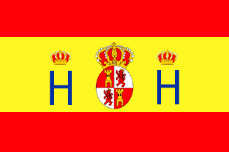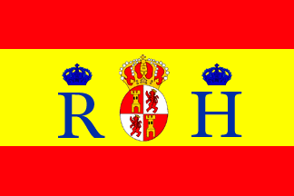 The said chart did show the ensign [with black, uncrowned letters] only because it was usually seen like that, but naval authorities constantly fought for the one with blue, crowned R and H to be used (cf. the correspondence in the manuscripts archive, Naval Museum Library, Madrid: Ms. 1441, doc. 26, fol. 84-95; and Ms. 1338, fol. 194-231). This argument went on until 1858, when the Queen Regent was forced to take part and order the use of the flag with blue, crowned R and H.