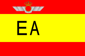 Spanish triband with black letters EA replacing the coat-of-arms and with the Air Force emblem (silver crowned wings) in the top red stripe above the letters. Source: Album des Pavillons 2000 [pay00].