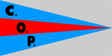 Burgee with horizontal stripes BRB ending in one point at the hoist; on each stripe letters "C." "O." "P."