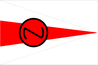 Navicon S.A., Madrid – burgee with tapering 3 horizontal stripes of white and red; in center red disk fimbriated black, black stylized "N."