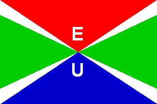 Proposal #11 is quartered per saltire white-red-white-blue with two smaller green triangles placed inside the white triangles and the white letters E and U placed in the red and blue triangle, respectively.